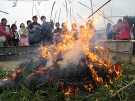 左義長とは、正月の飾り(注連縄)や薪等を 持ち寄り、芯 木の周りに山のように積み上げ、燃やす火祭りです。書き初めを燃やし、空高く舞い上がると習字が上達するとか、餅やするめを