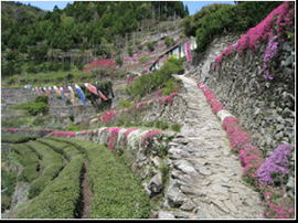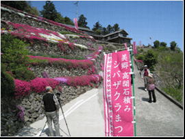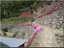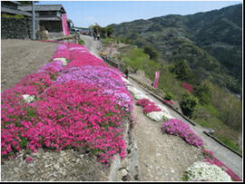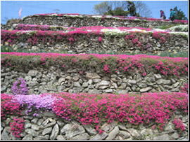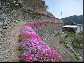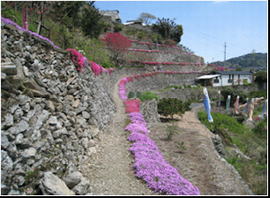 高開の石積みは、300年以上前に築かれた とされる約10段の段々畑、シバザクラは石積 みの縁に添って延べ約500mに植わっており、 鮮やかな花が石積みから垂れ下がっている。